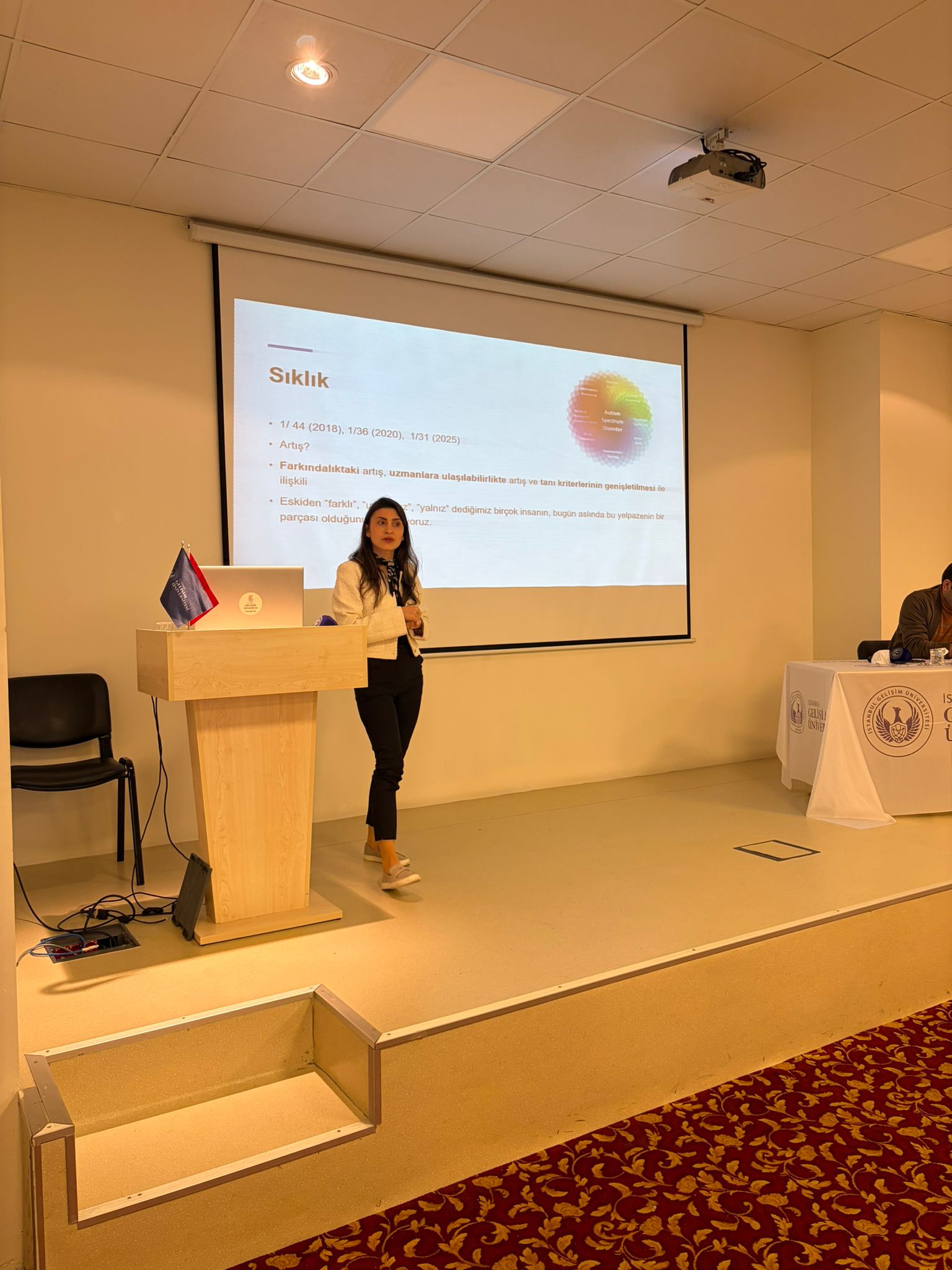 Etkinlikte otizm hakkında genel bir çerçeve sunulurken, otizmin nöroçeşitlilik perspektifiyle değerlendirilmesinin önemi vurgulandı. Konuşmacılar, otizmin yalnızca klinik bir tanıdan ibaret olmadığını, bireysel farklılıkların anlaşılması ve kabul edilmesi gereken bir nörogelişimsel çeşitlilik olarak ele alınması gerektiğini ifade etti.