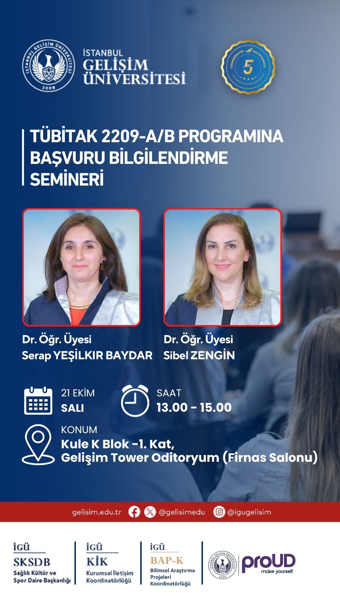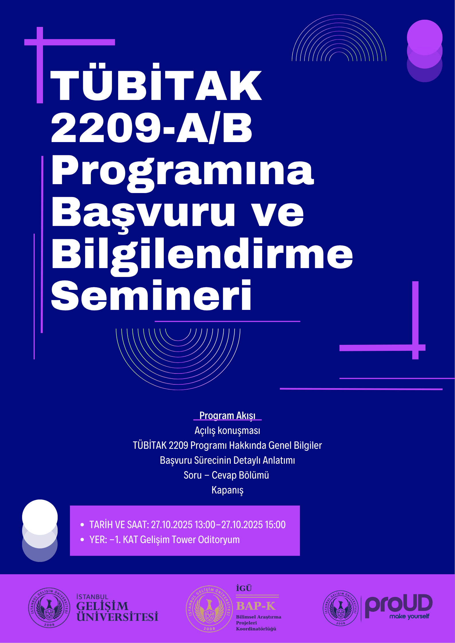 TÜBİTAK 2209 A/B başvuruları açıkken bu seminer, başvuru sürecinde sizi bir adım öne taşıyacak önemli bir fırsattır. Katılımınız bizler için çok kıymetlidir.