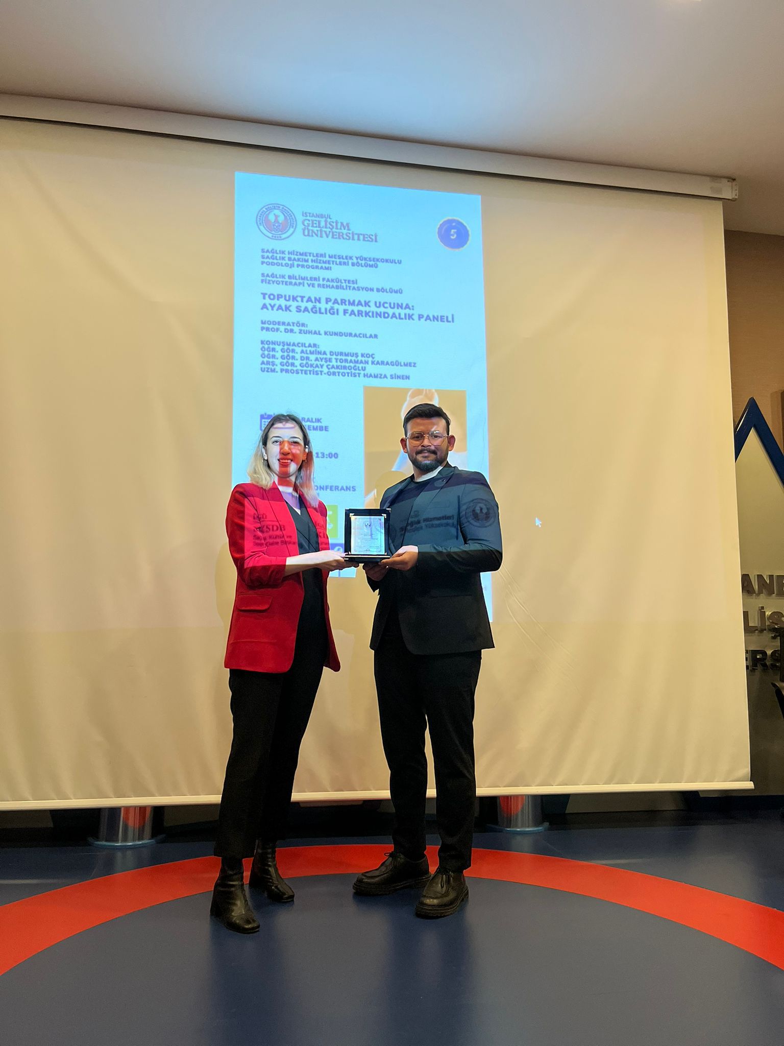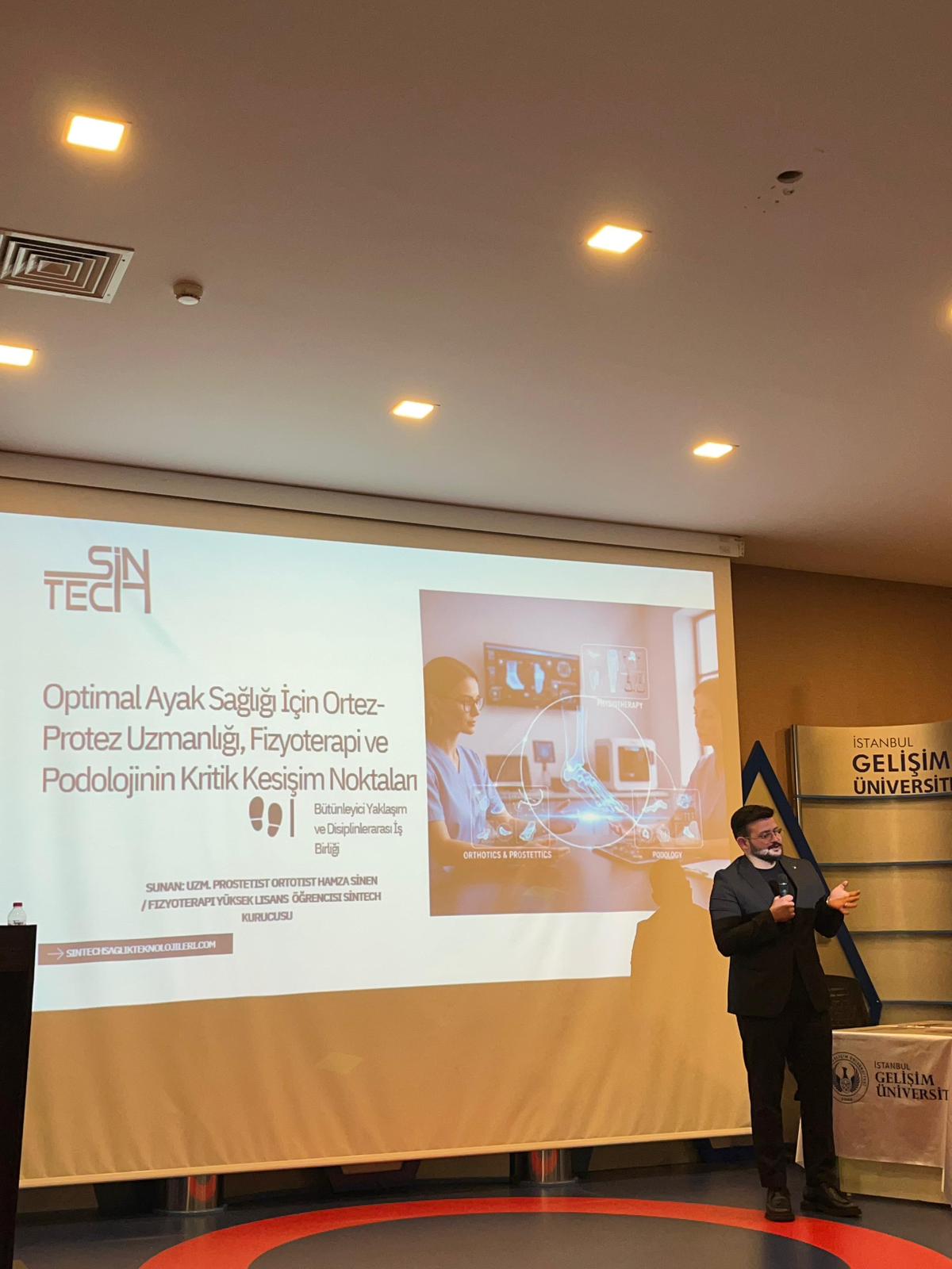 Panelin son oturumunda Uzm. Ortotist-Prostetist Hamza Sinen, “Optimal Ayak Sağlığı için Ortez ve Protez Uzmanlığı: Fizyoterapi ve Podolojinin Kritik Kesişim Noktası” başlıklı sunumunu gerçekleştirdi. Kişiye özel ortez ve protez uygulamalarının fonksiyonel iyileşme üzerindeki rolünü fizyoterapi ve podoloji ile eşgüdüm içinde ele alan Sinen, klinik örnekler üzerinden uygulamaya yönelik önemli paylaşımlarda bulundu.
