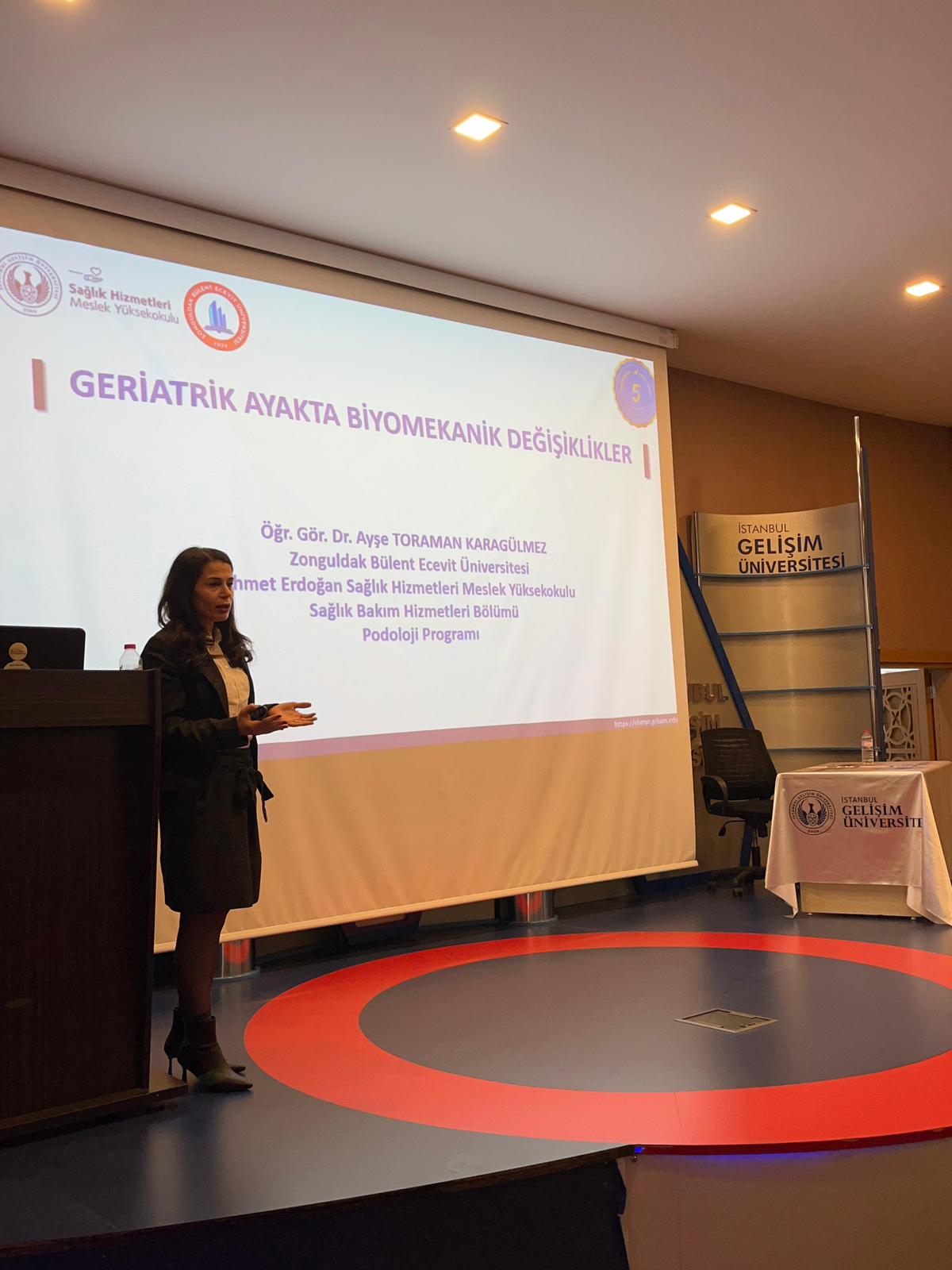 Panelin ikinci oturumunda Öğr. Gör. Dr. Ayşe Toraman Karagülmez (Zonguldak Bülent Ecevit Üniversitesi Ahmet Erdoğan Sağlık Hizmetleri Meslek Yüksekokulu Sağlık Bakım Hizmetleri Bölümü Podoloji Programı) “Geriatrik Ayakta Biyomekanik Değişiklikler” konusunu ele aldı. Yaşlanma sürecinde ayakta meydana gelen yapısal ve fonksiyonel değişimlerin; basınç dağılımı, denge kontrolü ve düşme riski üzerindeki etkileri bilimsel veriler ışığında değerlendirildi. Geriatrik bireylerde yaşam kalitesini artırmaya yönelik koruyucu ve destekleyici yaklaşımlar vurgulandı.
