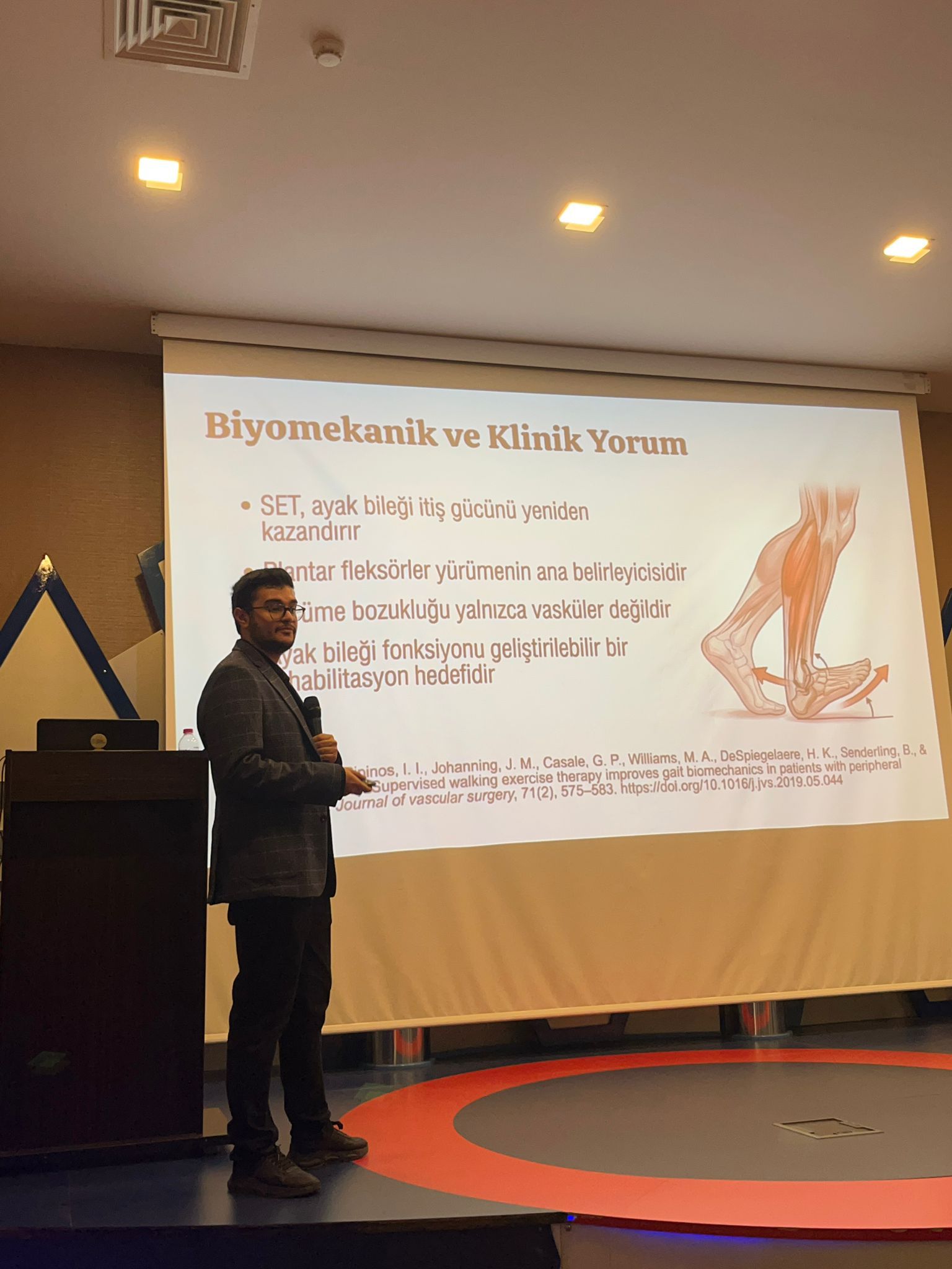 Üçüncü sunumda Arş. Gör. Gökay Çakıroğlu (İGÜ Sağlık Bilimleri Fakültesi Fizyoterapi ve Rehabilitasyon İngilizce Programı) “Kardiyopulmoner Rehabilitasyon ve Ayak” başlığı altında ayak fonksiyonunun yürüme kapasitesi, egzersiz toleransı ve fonksiyonel bağımsızlık üzerindeki etkilerini ele aldı. Kardiyopulmoner rehabilitasyon süreçlerinde ayak biyomekaniğinin göz ardı edilmemesi gerektiğini belirten Çakıroğlu, multidisipliner değerlendirmenin klinik kazanımları güçlendirdiğini vurguladı.