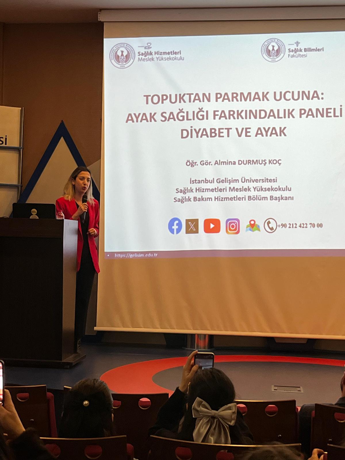 Panelin ilk oturumunda Öğr. Gör. Almina Durmuş Koç (İGÜ Sağlık Hizmetleri Meslek Yüksekokulu Podoloji Program Başkanı ve Sağlık Bakım Hizmetleri Bölüm Başkanı) “Diyabet ve Ayak” başlıklı sunumuyla diyabetin ayak sağlığı üzerindeki etkilerini kapsamlı biçimde ele aldı. Diyabetik ayak gelişiminde nöropatik ve vasküler faktörlerin rolüne değinen Koç, erken değerlendirme, düzenli takip ve hasta eğitiminin komplikasyonların önlenmesindeki belirleyici önemini vurguladı. Sunum, klinik örnekler ve güncel yaklaşımlar eşliğinde katılımcılara aktarıldı.